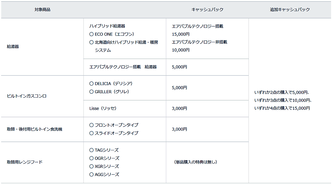 リンナイ株式会社(本社:愛知県名古屋市、社長:内藤 弘康)は、給湯器やキッチン機器を取り替え、ハイブリッド給湯器「ECO ONE(エコワン)」や、ビルトインガスコンロ「DELICIA(デリシア)」など当社指定商品を購入されたお客さまを対象に、キャッシュバックキャンペーンを実施します。