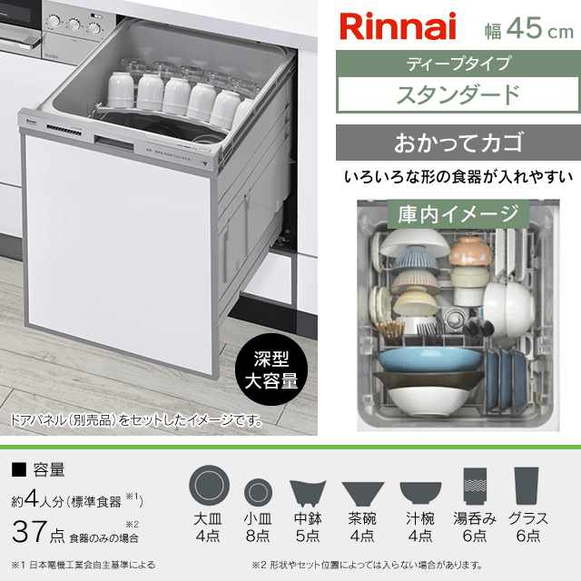 【工事費込み】RSW-SD401AE-SV[シルバー][おかってカゴ][スタンダード][自立脚付きタイプ]|リンナイ 食洗機 ドアパネル型|幅45cm・ディープ(深型)タイプ・スライドオープン