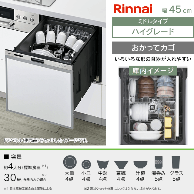 【工事費込み】RSW-405LPE[おかってカゴ][ハイグレード]|リンナイ 食洗機 ドアパネル型|幅45cm・ミドル(標準)タイプ・スライドオープン