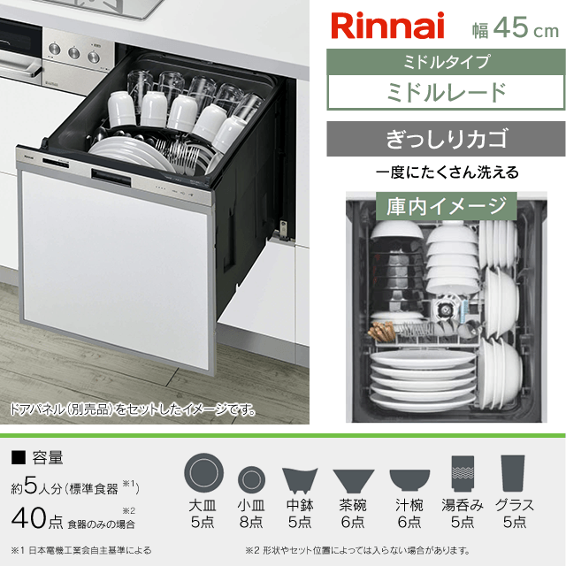 【工事費込み】RSW-405GP[ぎっしりカゴ][ミドルグレード]|リンナイ 食洗機 ドアパネル型|幅45cm・ミドル(標準)タイプ・スライドオープン