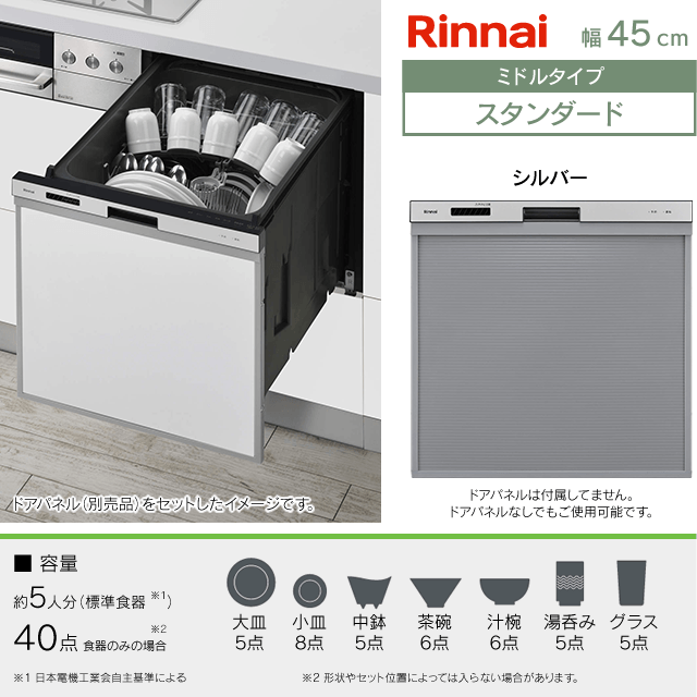 【工事費込み】RSW-405AA-SV[シルバー][スタンダード]|リンナイ 食洗機 ドアパネル型|幅45cm・ミドル(標準)タイプ・スライドオープン