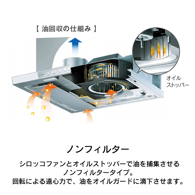 シロッコファンとオイルストッパーで油を捕集させるノンフィルタータイプ。回転による遠心力で、油をオイルガードに滴下させます。お掃除が面倒なフィルターがないうえ、インナーガードも採用し、レンジフード内部の汚れを防ぎます。