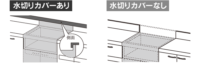 後板スライドタイプの専用キャビネット(UKCシリーズ)を取り付ける場合は、 キッチンの壁面に”水切りカバーが「ある」か「無い」か”をご確認ください。
