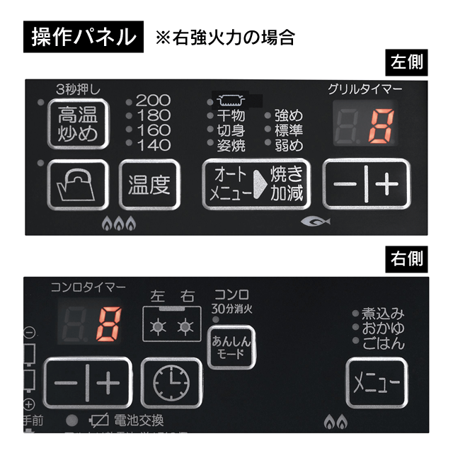 | さらに安心 | コンロ30分消火あんしんモード|低荷重温度センサー|コンロ・グリル消し忘れ消火機能|火力切り替えお知らせ機能|焦げつき消火機能|ロングスカート構造|ロック|グリル点火お知らせ機能 |