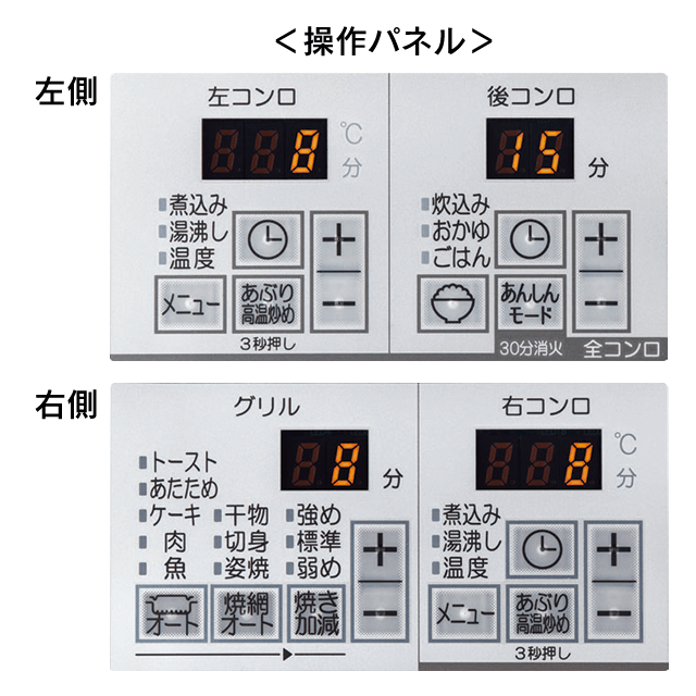 | さらに安心 | あんしんモード|ヒートカットグリル扉|鍋なし検知機能|感震停止機能|音声お知らせ機能|電源オートオフ機能|レンジフード連動機能|ロック|最終りれき確認機能(オプション・タブレット要) |