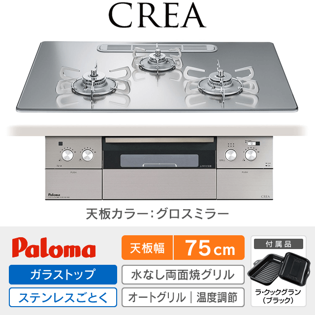 【工事費込み】パロマ ビルトインガスコンロ《クレア/CREA》[幅75cm]PD-963WT-U75GG