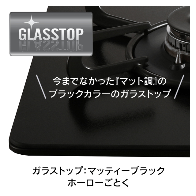 今までなかったマット調のブラックカラーのガラストップ。お手入れのしやすさはそのままに、こだわりのシックなキッチンに調和します。
