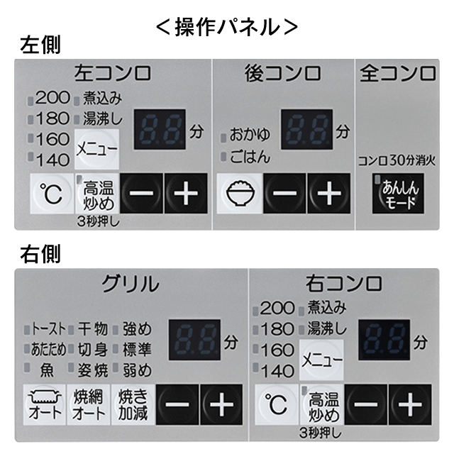| さらに安心 | あんしんモード|感震停止機能|低荷重温度センサー|レンジフード連動機能|ロック|グリル点火お知らせ機能 |