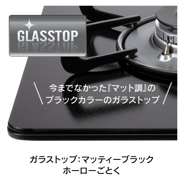 今までなかったマット調のブラックカラーのガラストップ。お手入れのしやすさはそのままに、こだわりのシックなキッチンに調和します。