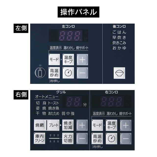 | 調理性能/コンロ | ダブル高火力&ダブルトロ火|炊飯機能※1|湯わかし機能|温度クック機能|焼サポート|温調&タイマー併用 |