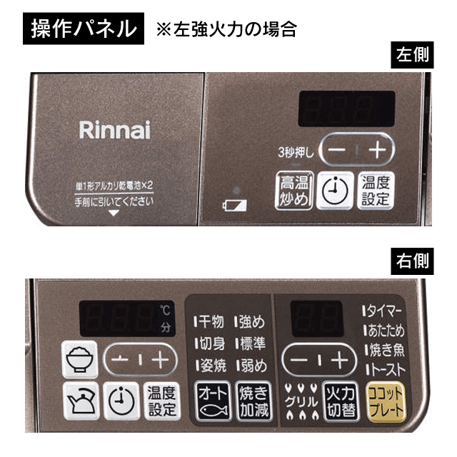 | 安全性能 | 消し忘れ消火機能|立消え安全装置|調理油過熱防止装置|焦げつき消火機能|グリル過熱防止機能|高温モード(あぶり・高温炒めスイッチ)|コンロ点火確認表示|点火ロック|中火点火機能 |