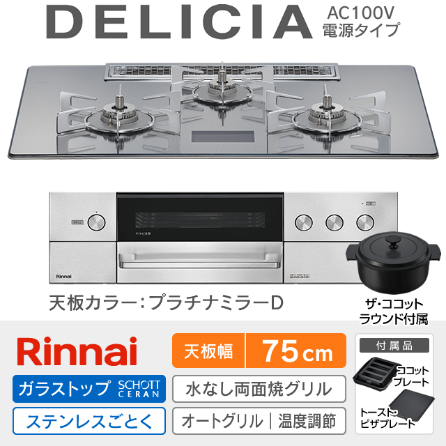 【工事費込み】リンナイ ビルトインガスコンロ《デリシア/DELICIA/100V電源》[幅75cm][ザ・ココットラウンド付属]RHS72W38M13VNSTW