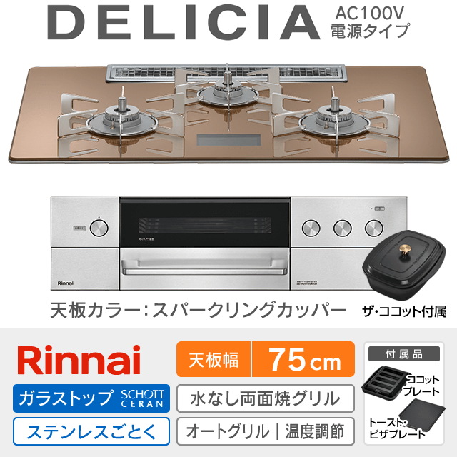 【工事費込み】リンナイ ビルトインガスコンロ《デリシア/DELICIA/100V電源》[幅75cm][ザ・ココット付属]RHS72W38M12VCSTW