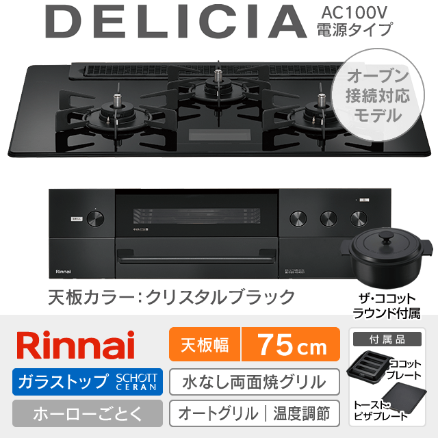【工事費込み】リンナイ ビルトインガスコンロ《デリシア/DELICIA/100V電源》[幅75cm][ザ・ココットラウンド付属]RHS71W38M17VNBW
