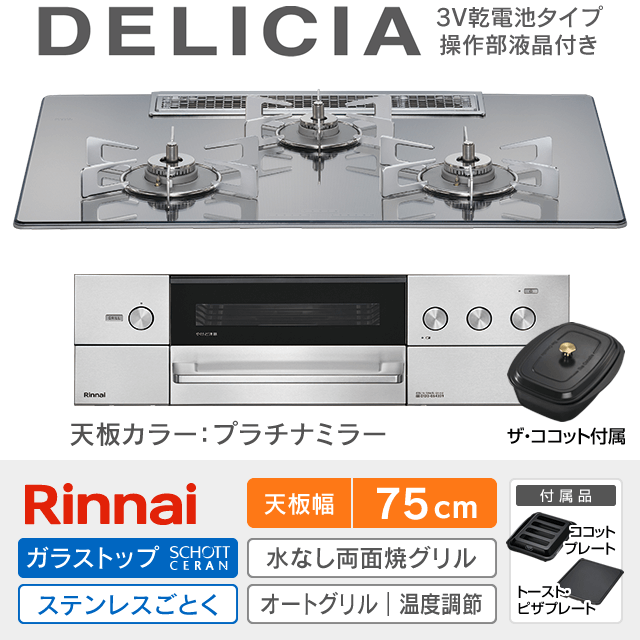 【工事費込み】リンナイ ビルトインガスコンロ《デリシア/DELICIA/3V乾電池・操作部液晶付き》[幅75cm][ザ・ココット付属]RHS72W38M13RCSTW