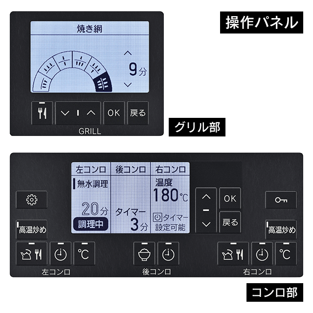 | 調理性能/グリル | グリルタイマー|水無し両面焼グリル|遠赤外線セラミックバーナー|オートグリル|グリルオートメニュー|ココットプレート対応|トースト・ピザプレート対応|連続オートグリル|パノラマワイドグリル |