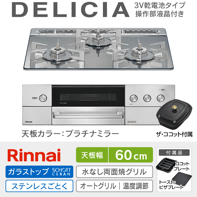 【工事費込み】リンナイ ビルトインガスコンロ《デリシア/DELICIA/3V乾電池・操作部液晶付き》[幅60cm][ザ・ココット付属]RHS31W38M13RCSTW