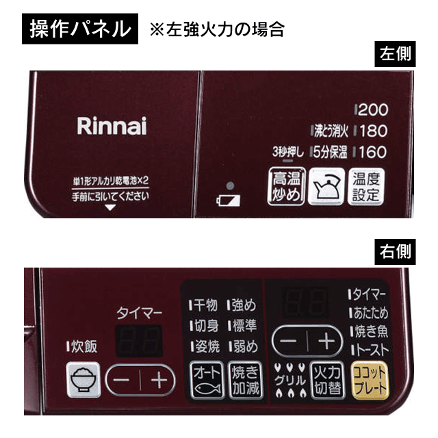 | 安全性能 | 消し忘れ消火機能|立消え安全装置|調理油過熱防止装置|焦げつき消火機能|グリル過熱防止機能|高温モード(あぶり・高温炒めスイッチ)|コンロ点火確認表示|点火ロック|中火点火機能 |