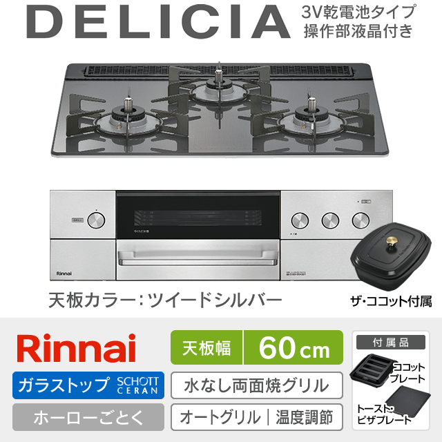 【工事費込み】リンナイ ビルトインガスコンロ《デリシア/DELICIA/3V乾電池・操作部液晶付き》[幅60cm][ザ・ココット付属]RHS31W38M15RCSTW