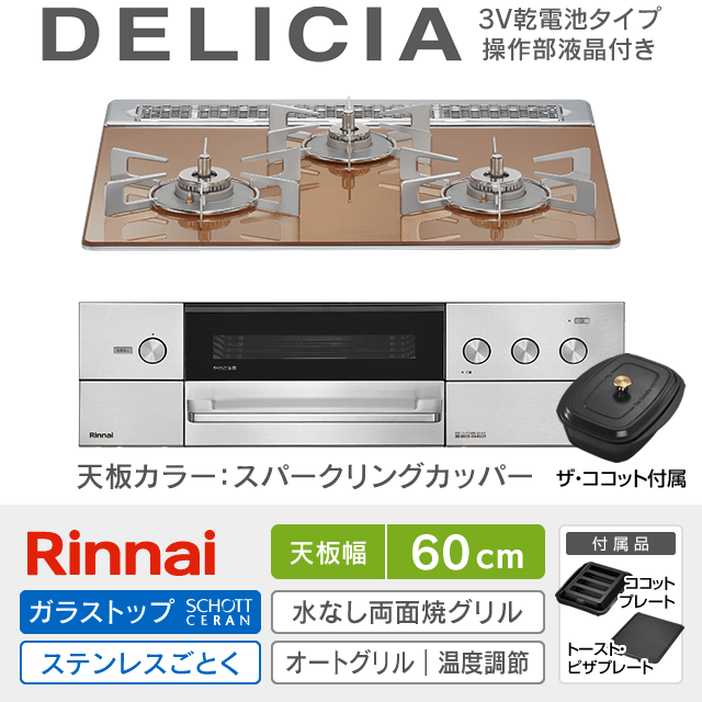 【工事費込み】リンナイ ビルトインガスコンロ《デリシア/DELICIA/3V乾電池・操作部液晶付き》[幅60cm][ザ・ココット付属]RHS31W38M12RCSTW