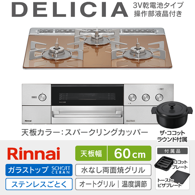 【工事費込み】リンナイ ビルトインガスコンロ《デリシア/DELICIA/3V乾電池・操作部液晶付き》[幅60cm][ザ・ココットラウンド付属]RHS31W38M12RNSTW