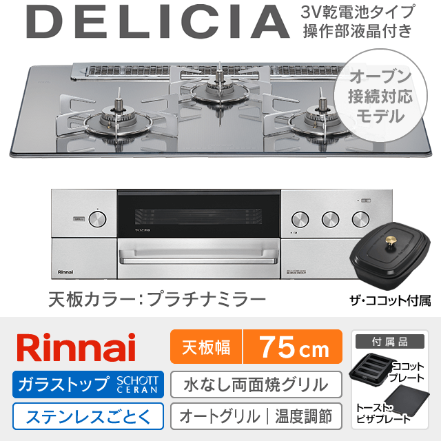 【工事費込み】リンナイ ビルトインガスコンロ《デリシア/DELICIA/3V乾電池・操作部液晶付き》[幅75cm][ザ・ココット付属]RHS71W38M13RCSTW