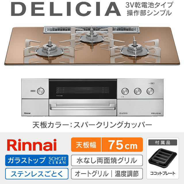 【工事費込み】リンナイ ビルトインガスコンロ《デリシア/DELICIA/3V乾電池・操作部シンプル》[幅75cm]RHS72W39M12RSTW