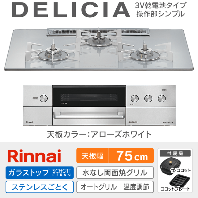 【工事費込み】リンナイ ビルトインガスコンロ《デリシア/DELICIA/3V乾電池・操作部シンプル》[幅75cm][ザ・ココット付属]RHS72W39M14RCSTW