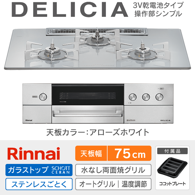 【工事費込み】リンナイ ビルトインガスコンロ《デリシア/DELICIA/3V乾電池・操作部シンプル》[幅75cm]RHS72W39M14RSTW