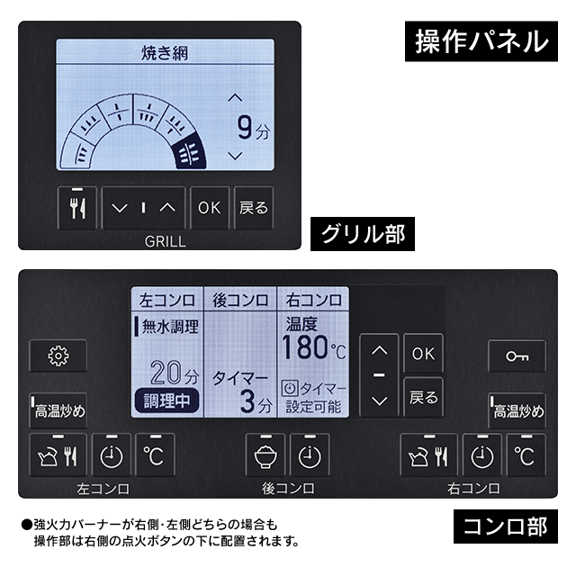 | 調理性能/グリル | グリルタイマー|水無し両面焼グリル|遠赤外線セラミックバーナー|オートグリル|グリルオートメニュー |ココットプレート対応|トースト・ピザプレート対応|連続オートグリル|パノラマワイドグリル |