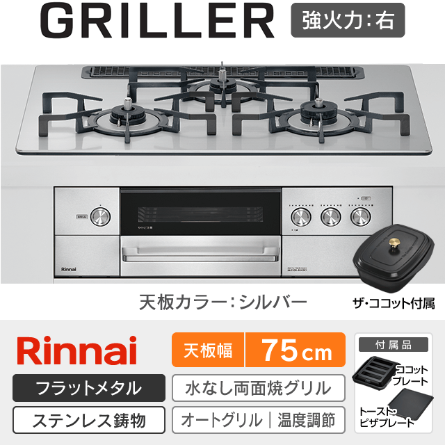 【工事費込み】リンナイ ビルトインガスコンロ《グリレ/GRILLER》[幅75cm][強火力:右]RHS71W34ALRSR