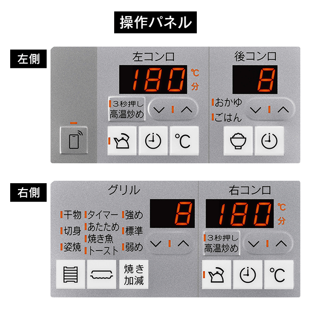 | 調理性能/グリル | グリルタイマー|水無し両面焼グリル|遠赤外線セラミックバーナー|オートグリル|グリルオートメニュー|ココットプレート対応|トースト・ピザプレート対応|連続オートグリル|パノラマワイドグリル |