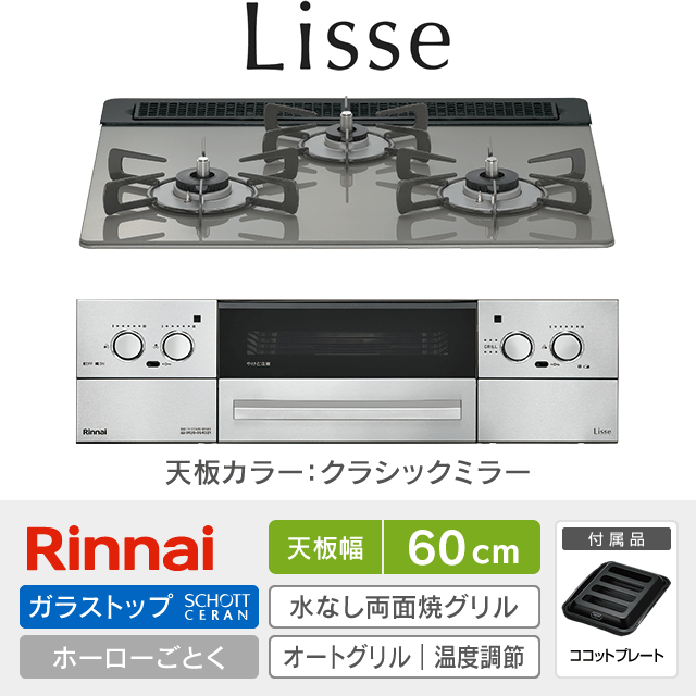 | 調理性能/グリル | グリルタイマー|水無し両面焼グリル|遠赤外線セラミックバーナー|オートグリル|グリルオートメニュー|ココットプレート対応|トースト・ピザプレート対応|連続オートグリル|パノラマワイドグリル |