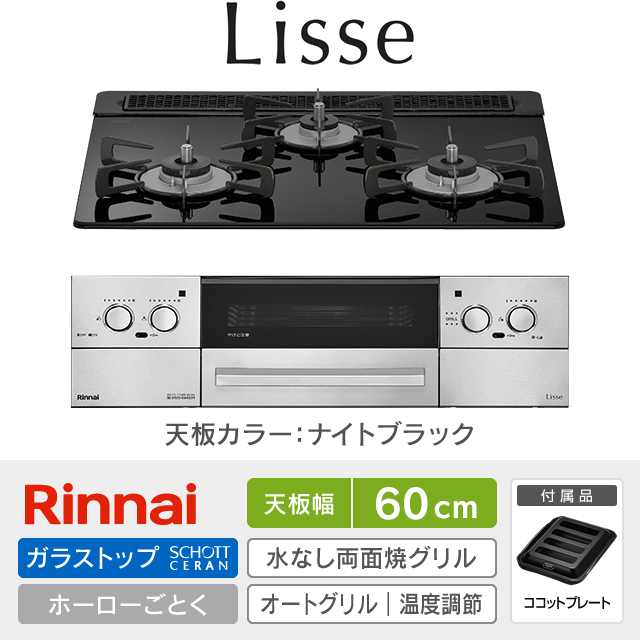| 調理性能/コンロ | リンナイ公式アプリ対応※|温度調節機能|炊飯機能|湯わかし機能|コンロタイマー|Wワイド火力バーナー |