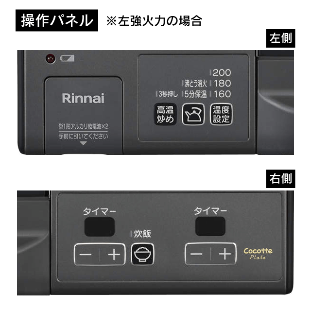 | 安全性能 | 消し忘れ消火機能|立消え安全装置|調理油過熱防止装置|焦げつき消火機能|グリル過熱防止機能|高温モード(あぶり・高温炒めスイッチ)|コンロ点火確認表示|点火ロック|中火点火機能 |