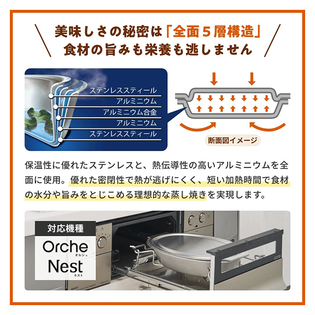 「Orche(オルシェ)」・「Nest(ネスト)」に対応するグリル専用鍋です。「無水調理」や「蒸し料理」などの料理を簡単にお楽しみいただけます。グリルで自動調理している間に他の作業もできるため、時短家事にも役立ちます。