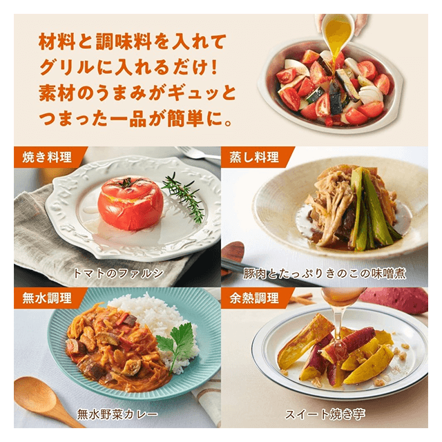 食卓にそのまま出せる美しいオーバルデザイン。曲線のオーバル形状は角がなく、調理後のお手入れ性がしやすいメリットも。また、フタがあるのでグリル庫内を汚すことなく気軽にグリル調理が楽しめます。