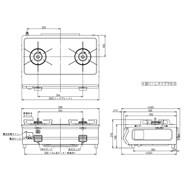 | 安全性能 | 消し忘れ消火機能|立消え安全装置|調理油過熱防止装置|焦げつき消火機能|高温モード(あぶり・高温炒めスイッチ)|コンロ点火確認表示|点火ロック|中火点火機能 |