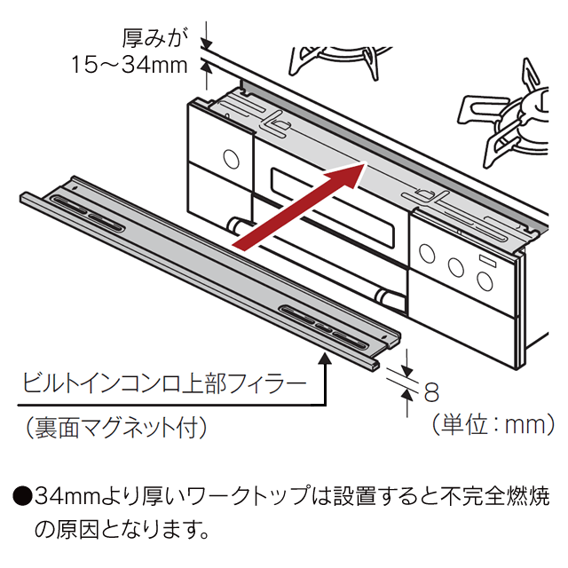 ●厚みが15〜34mmのワークトップに設置できます。34mmより厚いワークトップは設置すると不完全燃焼の原因となります。