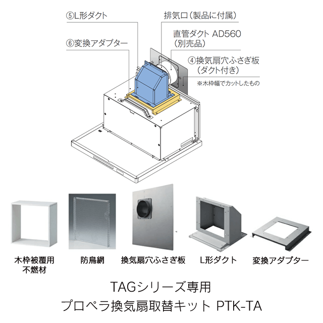 プロペラ換気扇タイプからTAGシリーズへリフォームする場合に必要なパーツをセットにした便利なキットです。