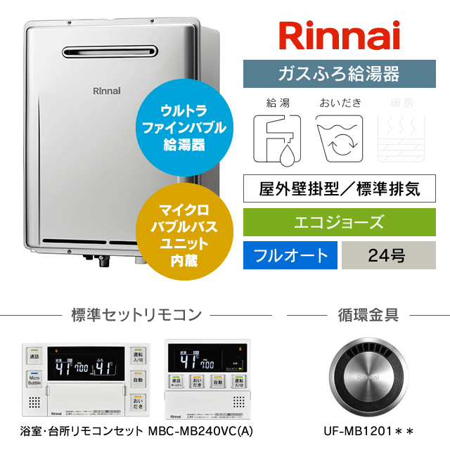 【工事費込み】RUF-UME2406AW(A)|リンナイ ガスふろ給湯器|マイクロバブルバスユニット内蔵ウルトラファインバブル給湯器|エコジョーズ|屋外壁掛型|24号|フルオート
