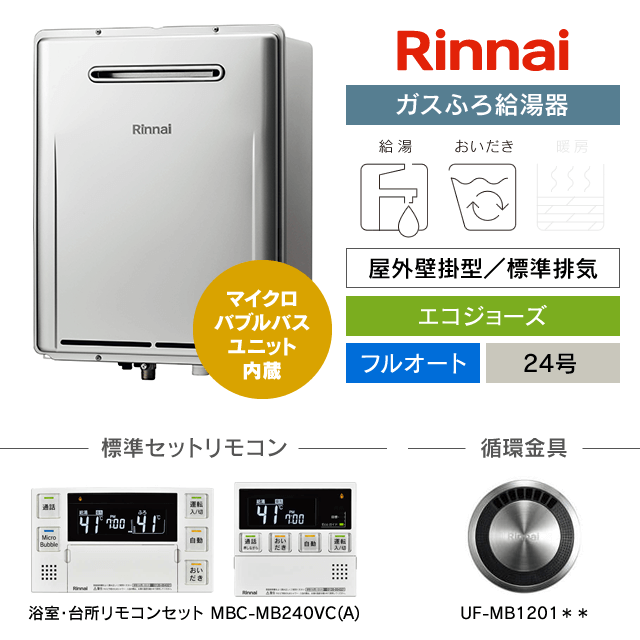 【工事費込み】RUF-ME2406AW(A)|リンナイ ガスふろ給湯器|マイクロバブルバスユニット内蔵|エコジョーズ|屋外壁掛型|24号|フルオート