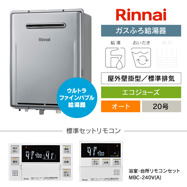 【工事費込み】RUF-UE200FSAW|リンナイ ガスふろ給湯器|ウルトラファインバブル給湯器|エコジョーズ|屋外壁掛型|20号|オート