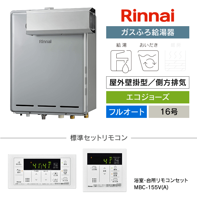 【工事費込み】RUF-E161EAA|リンナイ ガスふろ給湯器|エコジョーズ|屋外壁掛型/側方排気|16号|フルオート