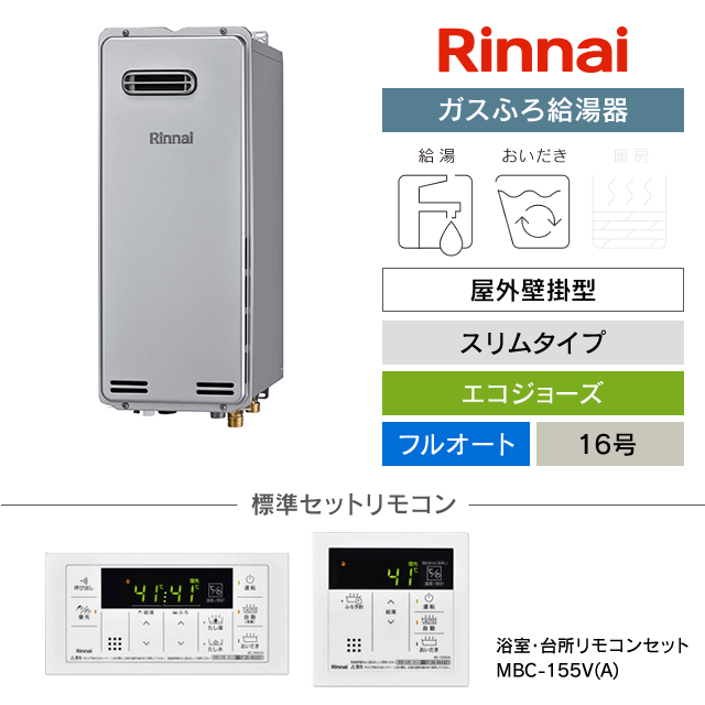 【工事費込み】RUF-SE1615AW(B)|リンナイ ガスふろ給湯器|エコジョーズ|屋外壁掛型/スリムタイプ|16号|フルオート