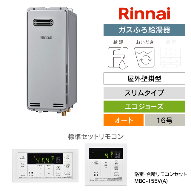 【工事費込み】RUF-SE1615SAW(B)|リンナイ ガスふろ給湯器|エコジョーズ|屋外壁掛型/スリムタイプ|16号|オート