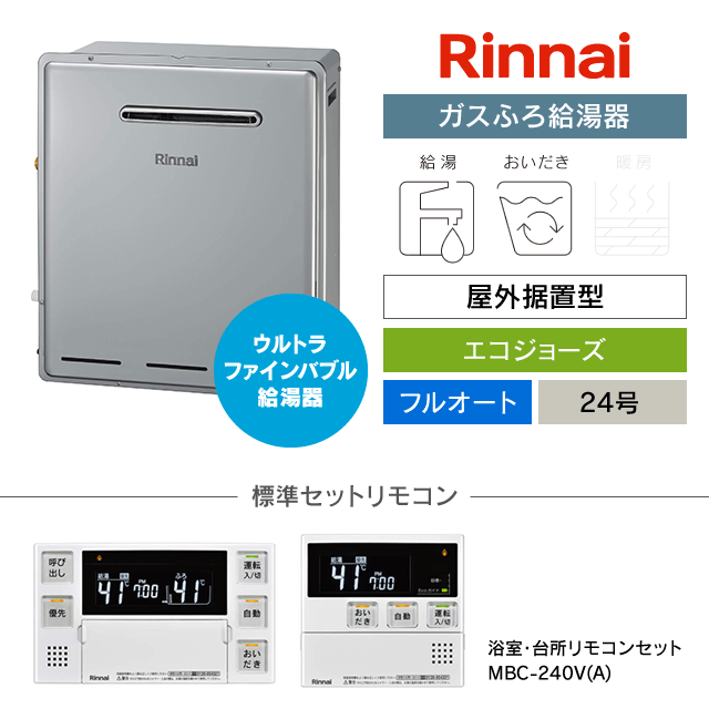 【工事費込み】RUF-UE2405AG|リンナイ ガスふろ給湯器|ウルトラファインバブル給湯器|エコジョーズ|屋外据置型|24号|フルオート