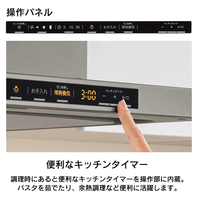 調理時にあると便利なキッチンタイマーを操作部に内蔵。パスタを茹でる際など便利に活用でき、キッチン周りもスッキリ。