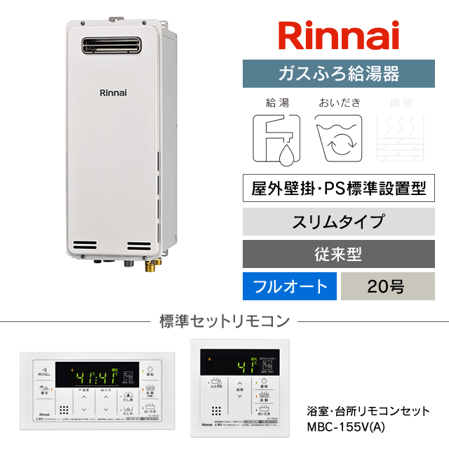 【工事費込み】RUF-SA2005AW(A)|リンナイ ガスふろ給湯器|屋外壁掛・PS標準設置型|スリムタイプ|20号|フルオート