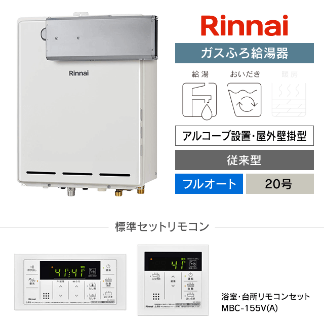 【工事費込み】RUF-A2005AA(C)|リンナイ ガスふろ給湯器|アルコーブ設置・屋外壁掛型|20号|フルオート